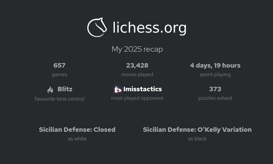 However; I made some stark realizations during this journey. Did I complete the challenge? I will say not at all. Did I play a lot of blitz? Indeed. Not sure if I made it to 100 games or not within the time frame but, I did find I played over 500 blitz games on the year in my Lichess Wrapped 2025.